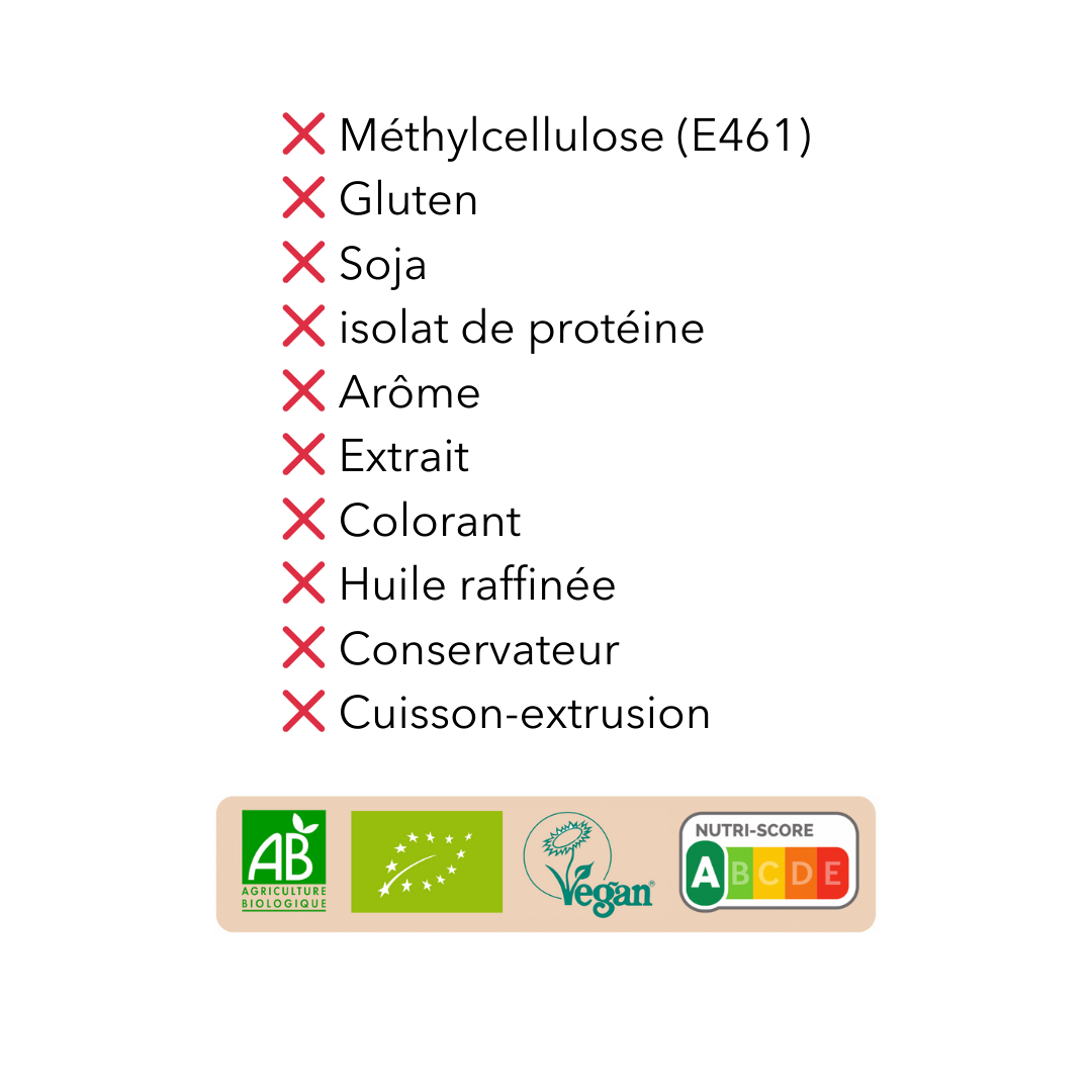 Contrairement à de nombreux produits du rayon charcuterie et traiteur (vegan ou non), nous n'utilisons jamais de méthylcellulose (E461), de gluten, de soja, d'isolat de protéine, d'arôme (artificiel ou naturel), d'extrait, de colorant, d'huile raffinée, de conservateur. Nous n'employons aucun procédé tel que la cuisson-extrusion non plus. Nous croyons en la transparence et en la simplicité de nos recettes dans l'intérêt de votre santé.